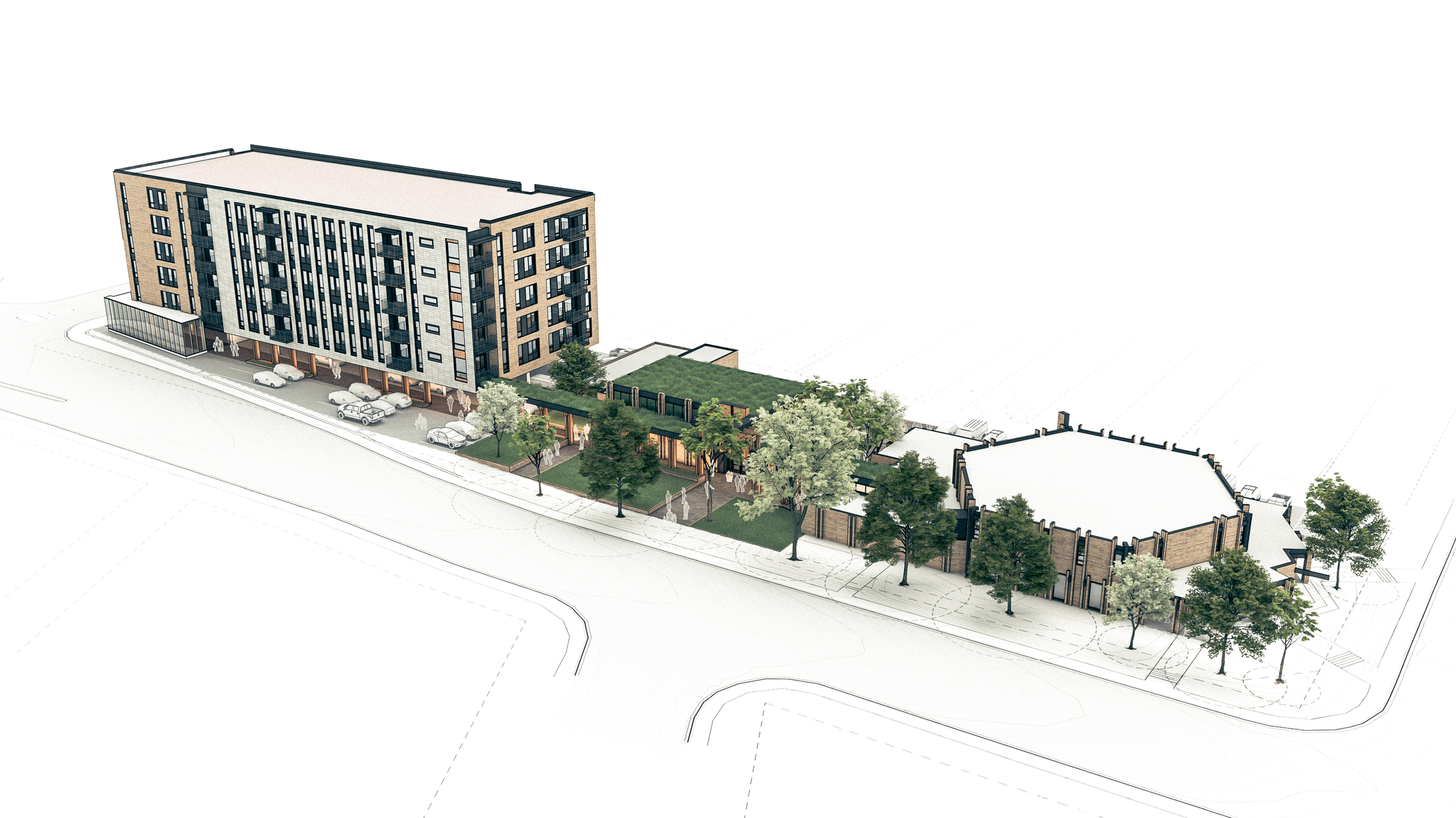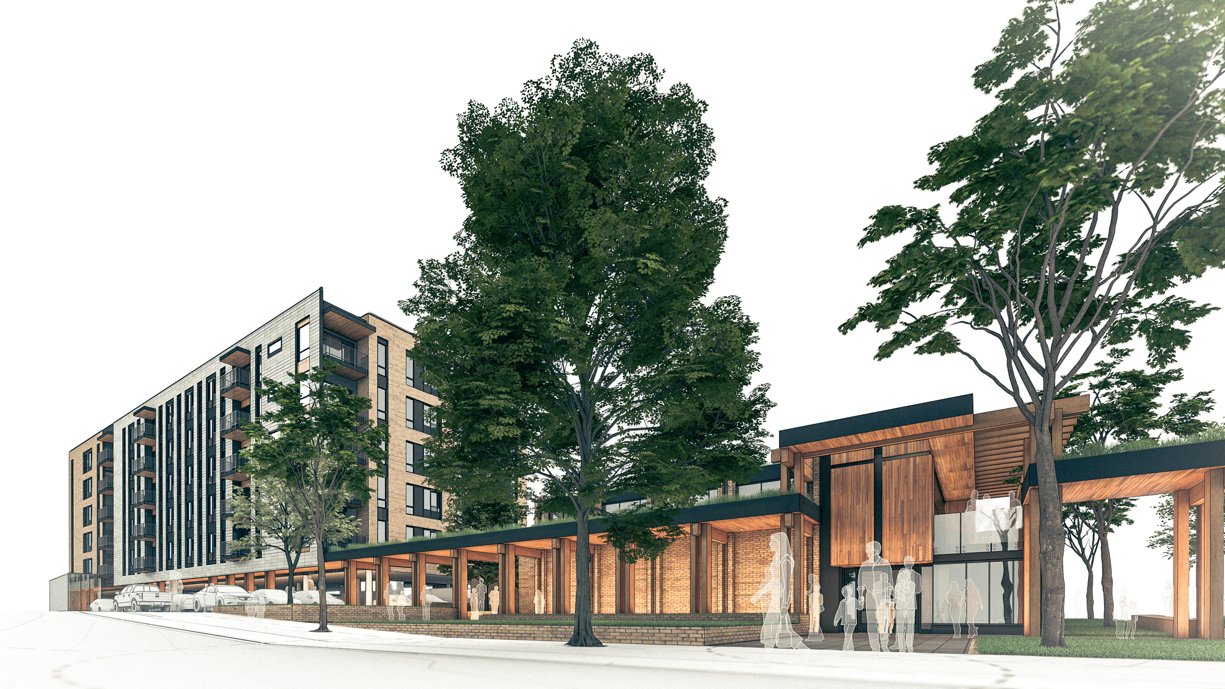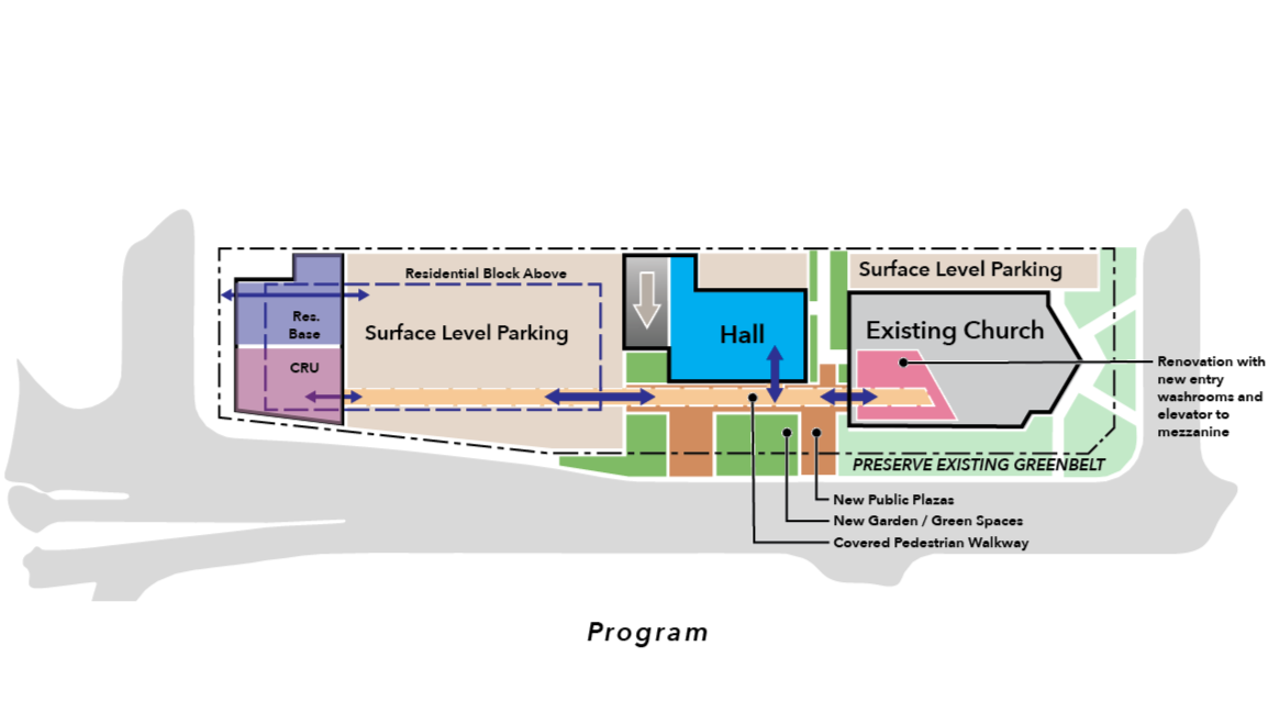 The five-storey mixed-use building features modern residential units that balance functionality with thoughtful design to create a welcoming urban living environment. The church renovation includes targeted upgrades such as improved accessible entrances, clearly defined and safe egress paths, and the addition of accessible washrooms.