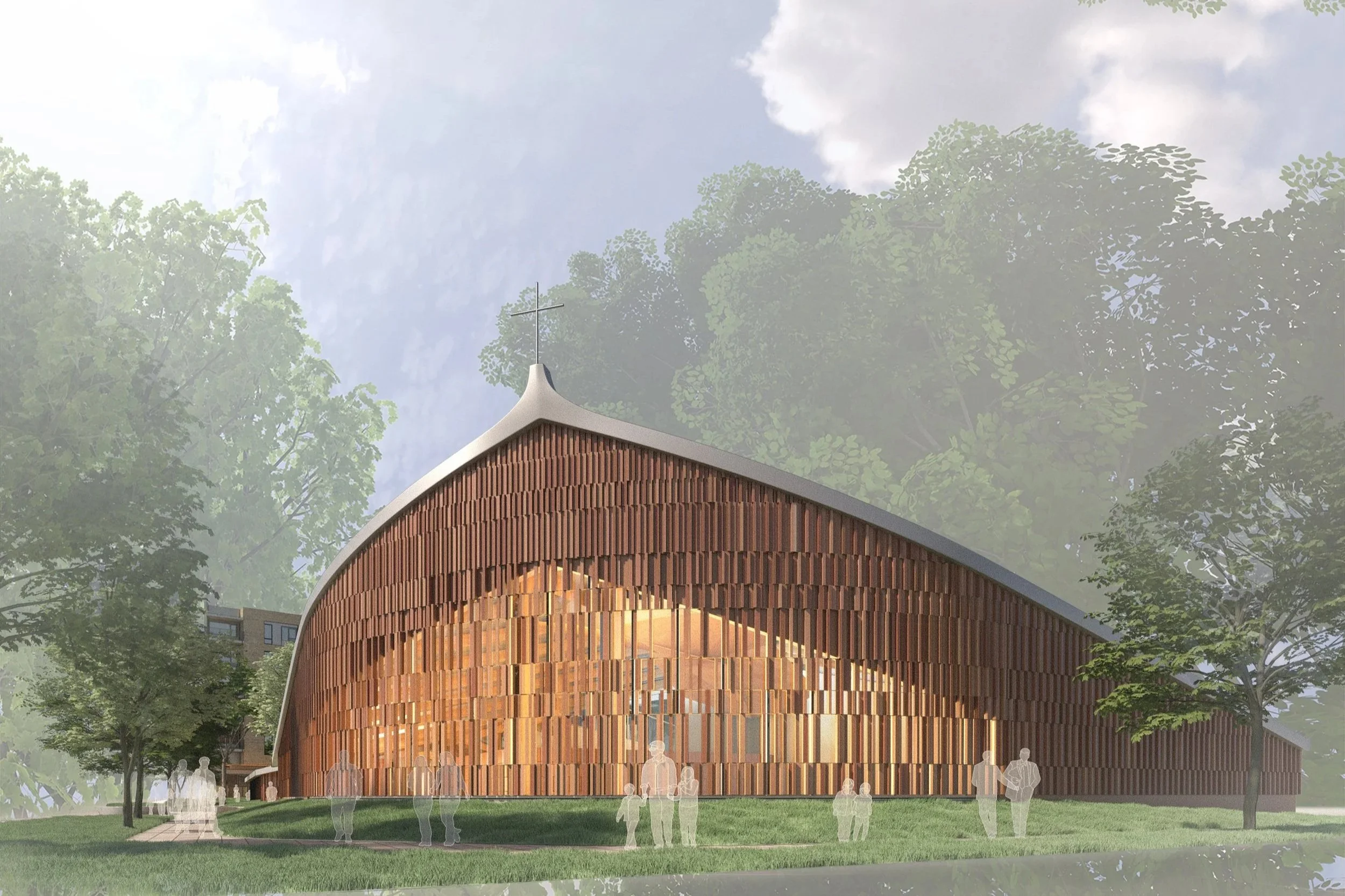 In early 2025, representatives of a Calgary Catholic parish invited us to join a three-firm competition to reimagine their church and surrounding block. The project required a mixed-use development combining a Residential Building and a Catholic Church, each with distinct programs yet coordinated across the site. A central objective was to create a unified mixed-use development that responds to the sites contrasting edges while preserving the mature tree canopy the community is known for. The design needed to maintain the church’s presence as a community landmark while introducing new residential density that engages the street and supports an active public realm. Another aim was to provide intuitive circulation and a coherent experience for both residents and parishioners, whether arriving on foot or by car. Additional objectives included delivering high-quality residential units with appropriate privacy, integrating public-facing ground-floor uses, and organizing the sanctuary and supporting spaces to create a luminous, contemplative interior. Each building was required to retain its own identity while contributing to a cohesive architectural composition rooted in daylight, greenery, and contextual sensitivity.