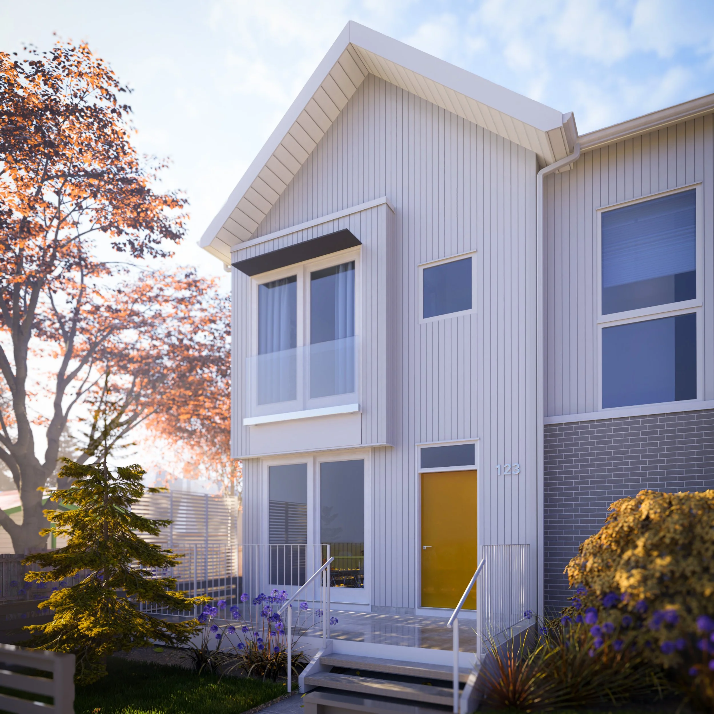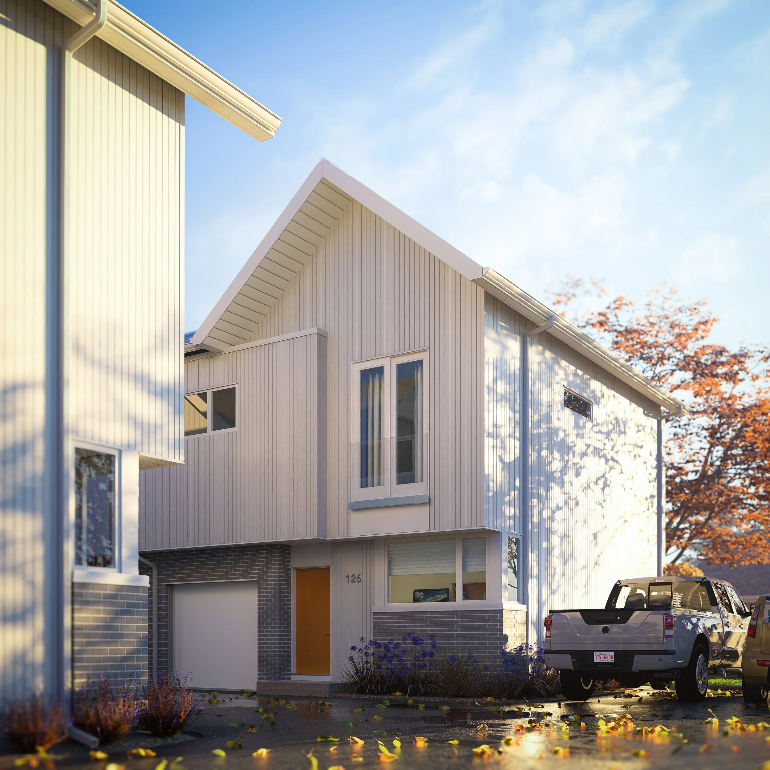 The design is highly adaptable, working efficiently on flat to moderately sloped sites, can be configured for corner lots, and offers optional floor plan layouts to suit a range of household needs—from young professionals to new families and downsizers. The architectural expression is clean and modern, featuring vertical wood-look siding, soft white brick, and light oak accents to create warmth and visual interest. Juliet balconies, canopies, and privacy screens contribute to an approachable, pedestrian-friendly streetscape.