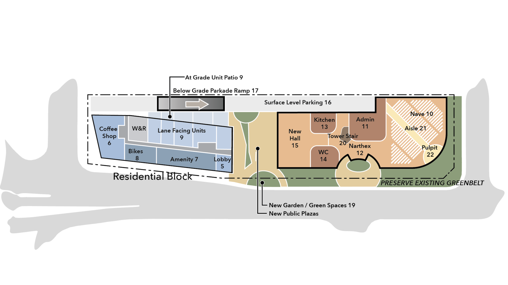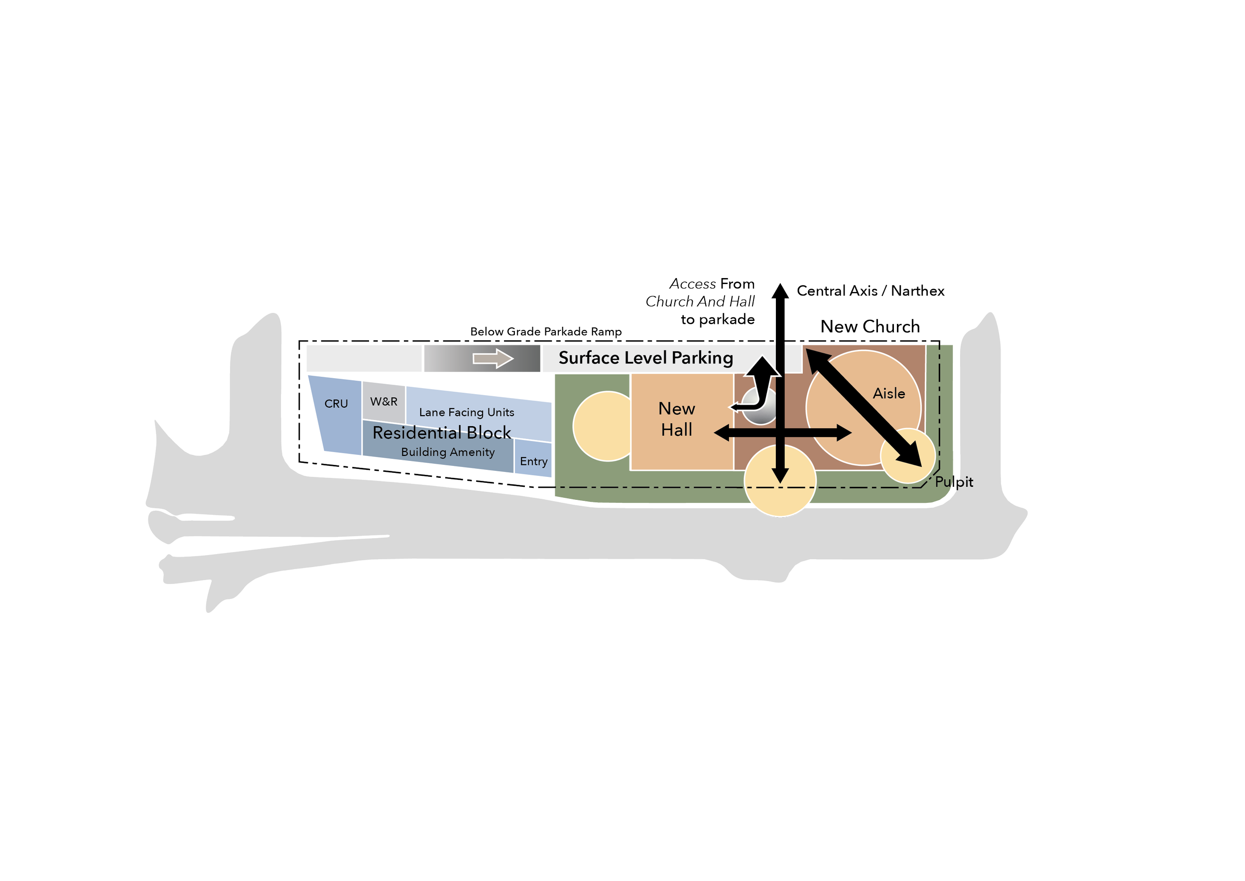 The program includes a five-storey residential building with ground-floor public uses such as a coffee shop, amenities, and bicycle storage, below efficiently planned apartment units. The 10,000 sq. ft. worship facility is organized around a double-height nave, supported by offices, gathering spaces, and community functions. While the two buildings have distinct identities, they are unified through coordinated massing, shared underground parking, and clear, intuitive circulation for both residents and parishioners.