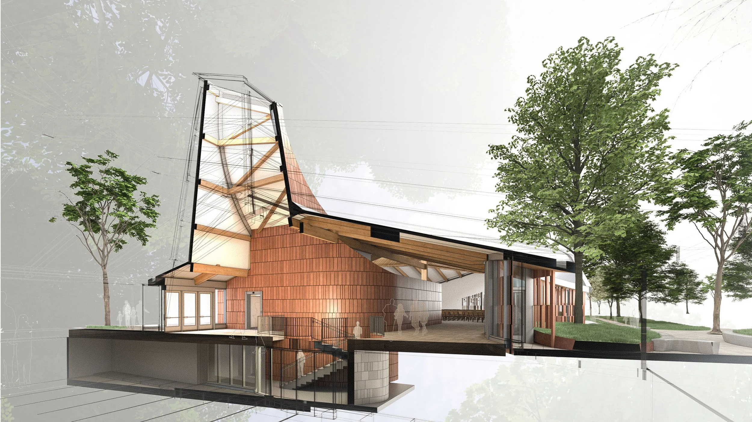 The project proposes a mixed-use redevelopment of a long-established Catholic parish site in Calgary, combining a new church and residential building within a complex urban and neighbourhood context. Situated along a busy arterial road and adjacent to a major freeway, the site also borders a low-density residential area defined by a mature deciduous tree canopy. Preserving this greenery and the church’s role as a community landmark were central to the design approach.